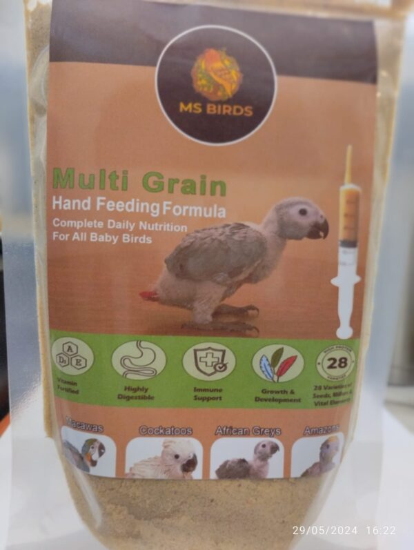 A multi‑grain hand feeding formula designed for baby birds to provide balanced nutrition, energy, and growth support during early life stages.