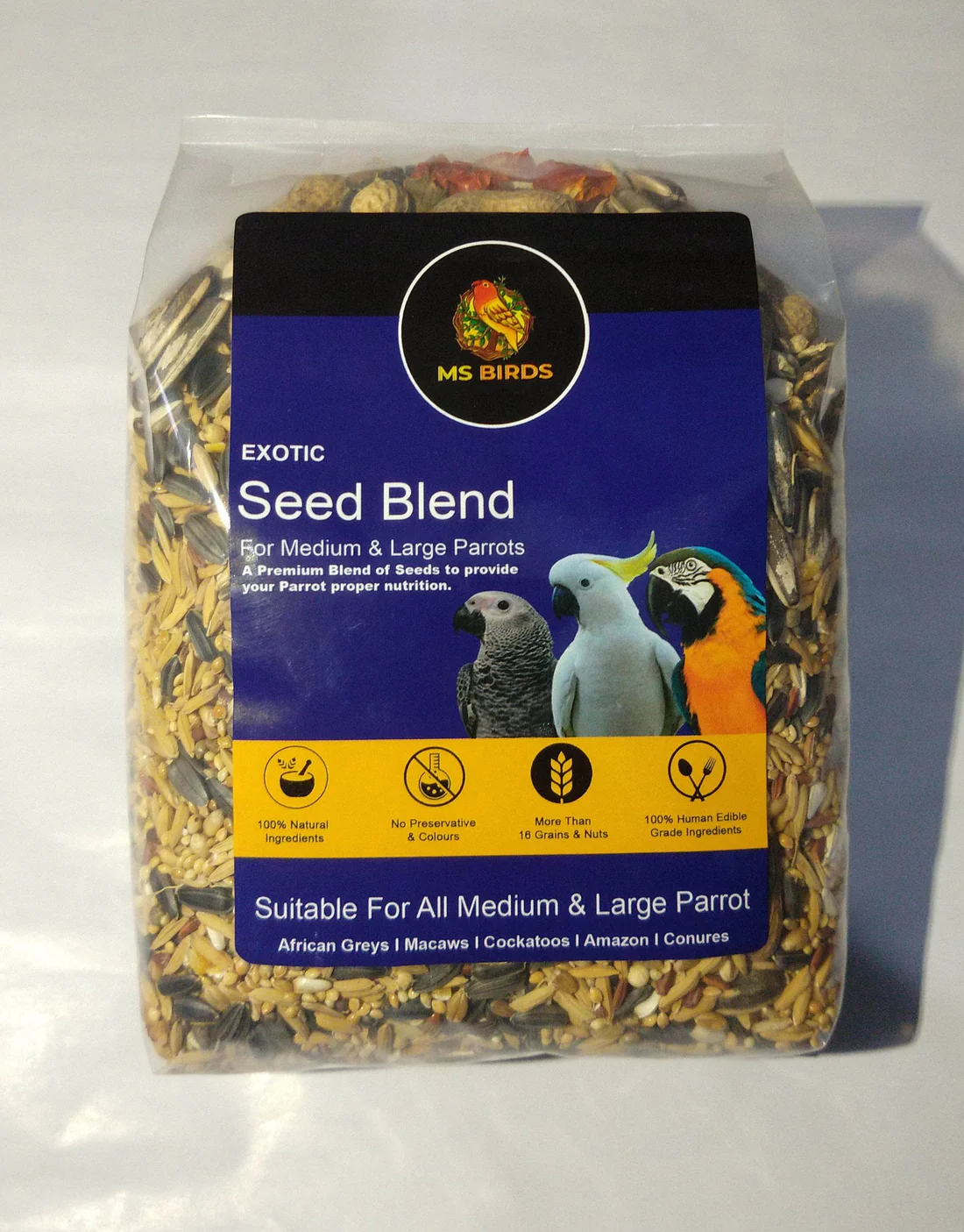 A premium exotic seed blend formulated to provide balanced nutrition, essential fats, and proteins for medium and large parrots — perfect for everyday feeding.