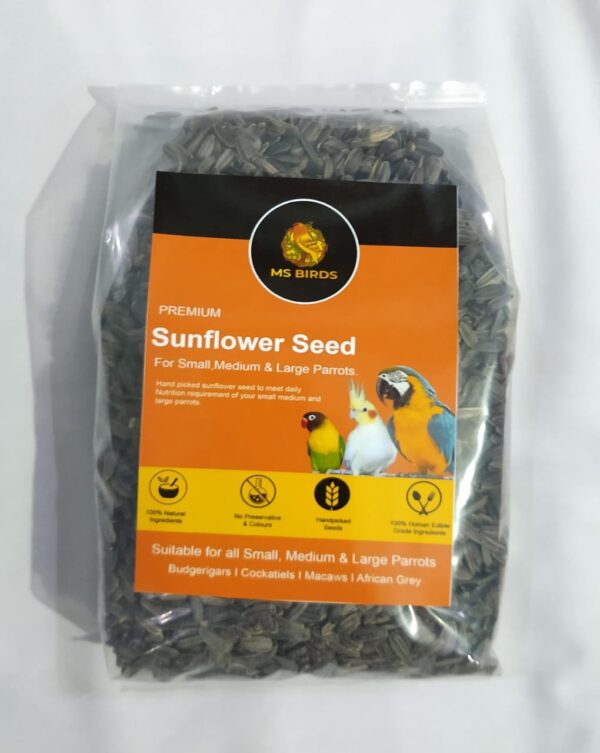 Nutritious sunflower seeds formulated to support healthy growth, energy, and feather condition for small, medium, and large parrots — ideal for daily feeding.